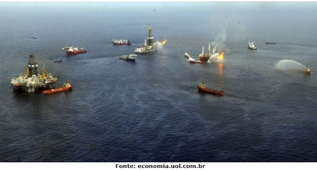 10. (ERSHC–2016). Fotografia aérea mostra a queima do petróleo captado no golfo do México pelas equipes de limpeza da BP